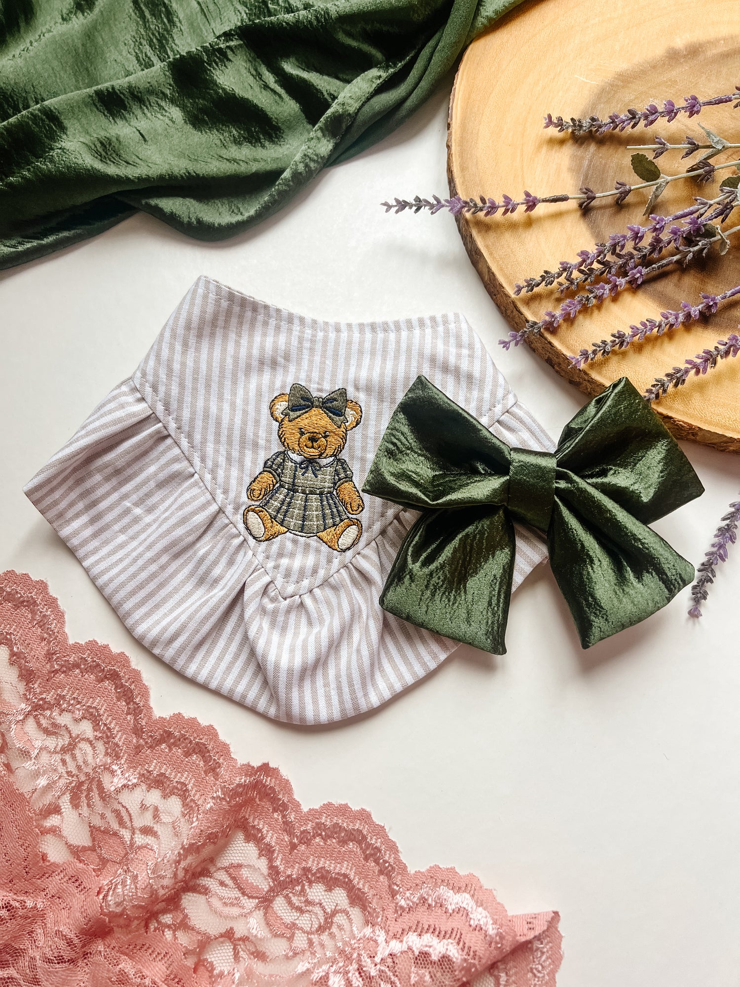 The matching Hair Bow or Bow Tie is attached with a standard metal silver alligator clip. HAIR BOW OR BOW TIE SOLD SEPARATELY