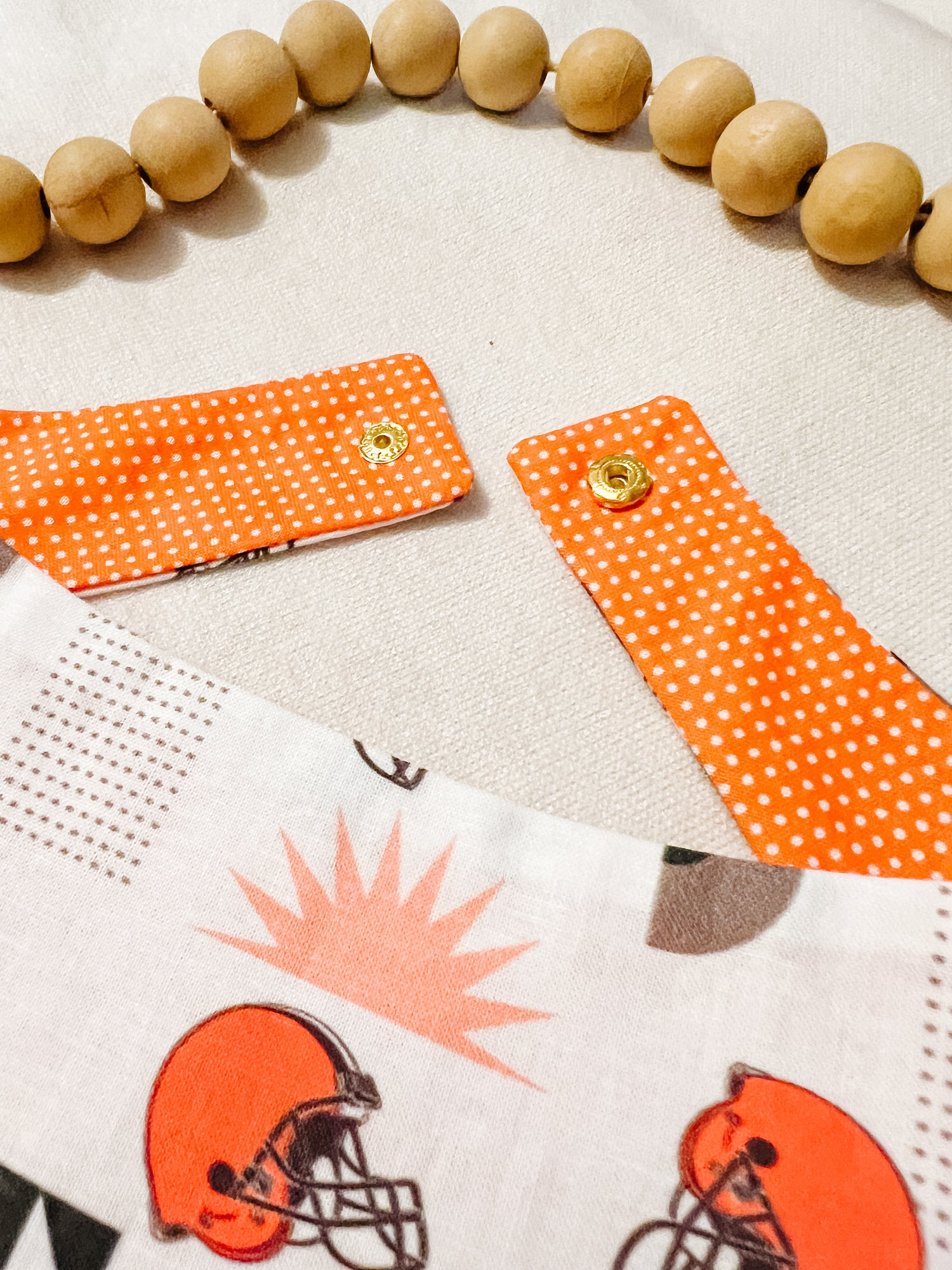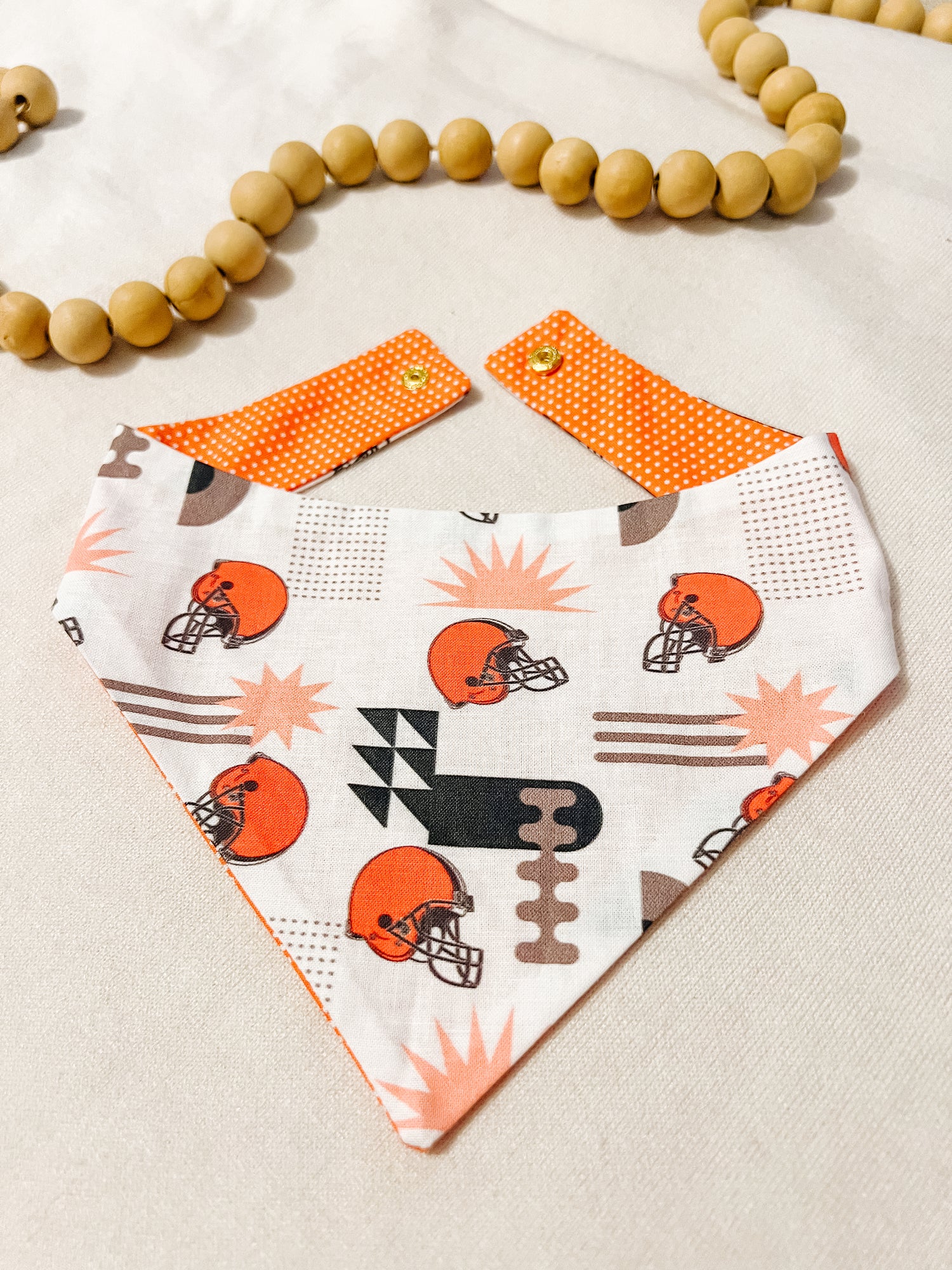 Cotton, curved neck pet bandana with one set of metal snaps. Some styles are reversible so your pet can have 2 outfits in 1 bandana.