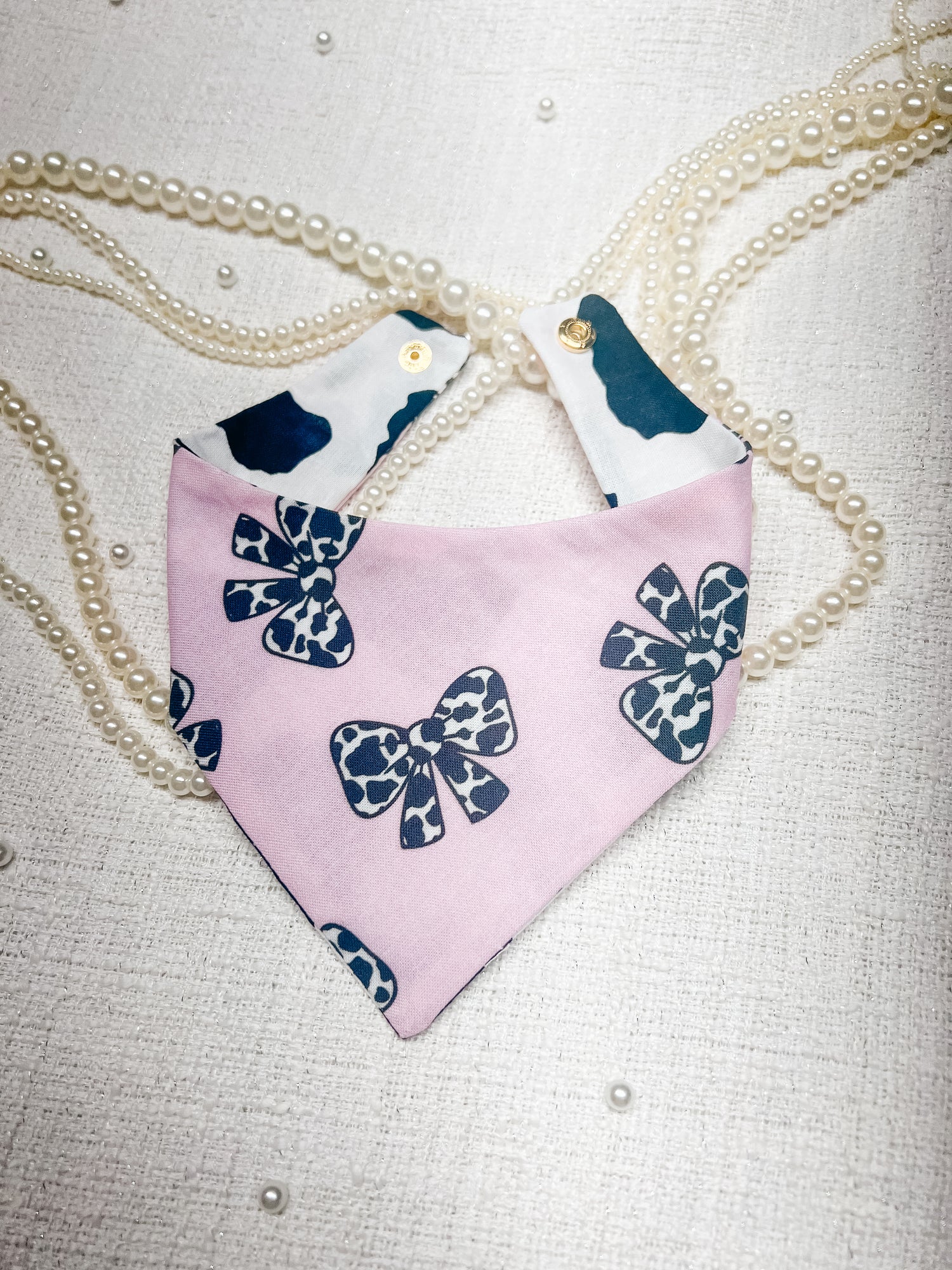 Cotton, curved neck pet bandana with one set of metal snaps. Some styles are reversible so your pet can have 2 outfits in 1 bandana.