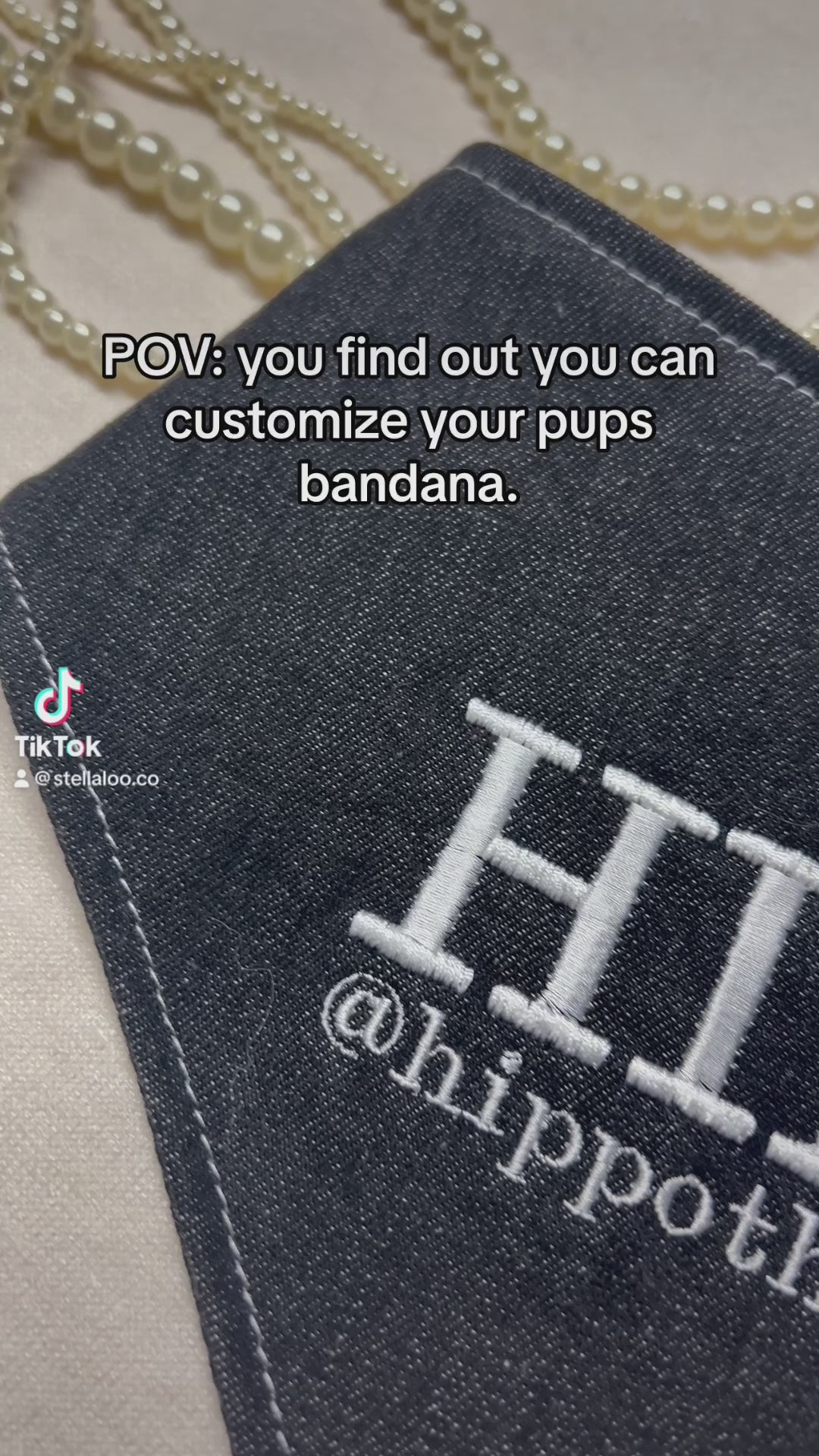 Embroidery black denim bandana that is customized with your pets name and handle. Two sets of metal snaps. Some styles are reversible so your pet can have 2 outfits in 1 bandana.