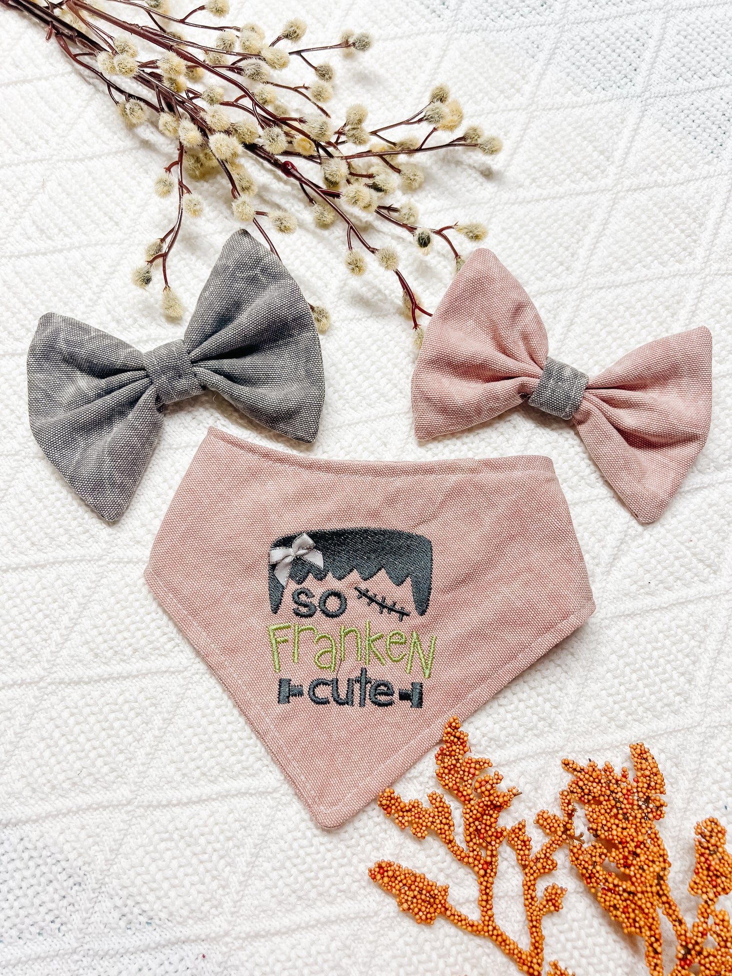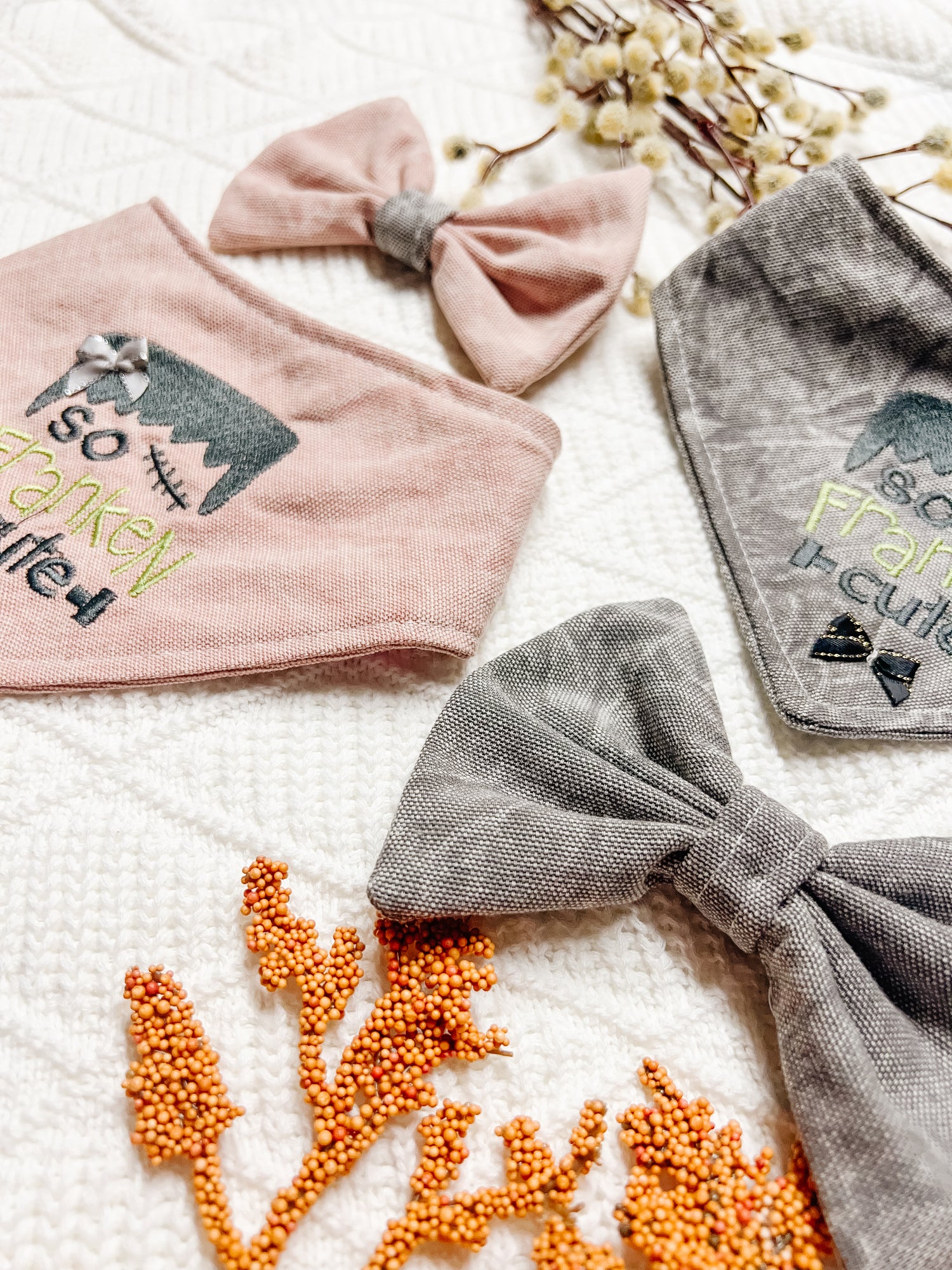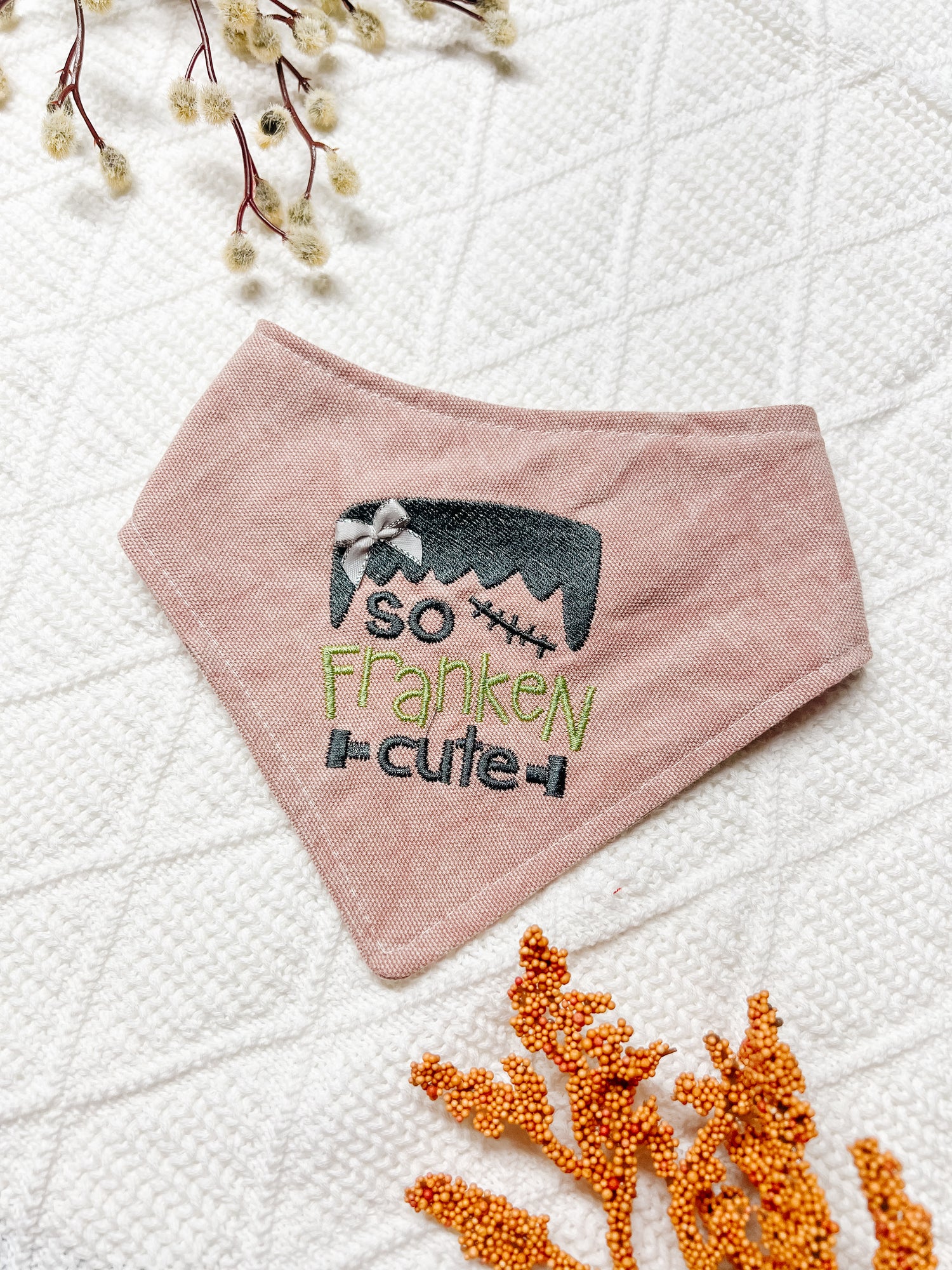 Embroideryon denim with a lace ruffle finish. Two sets of metal snaps. Some styles are reversible so your pet can have 2 outfits in 1 bandana.
