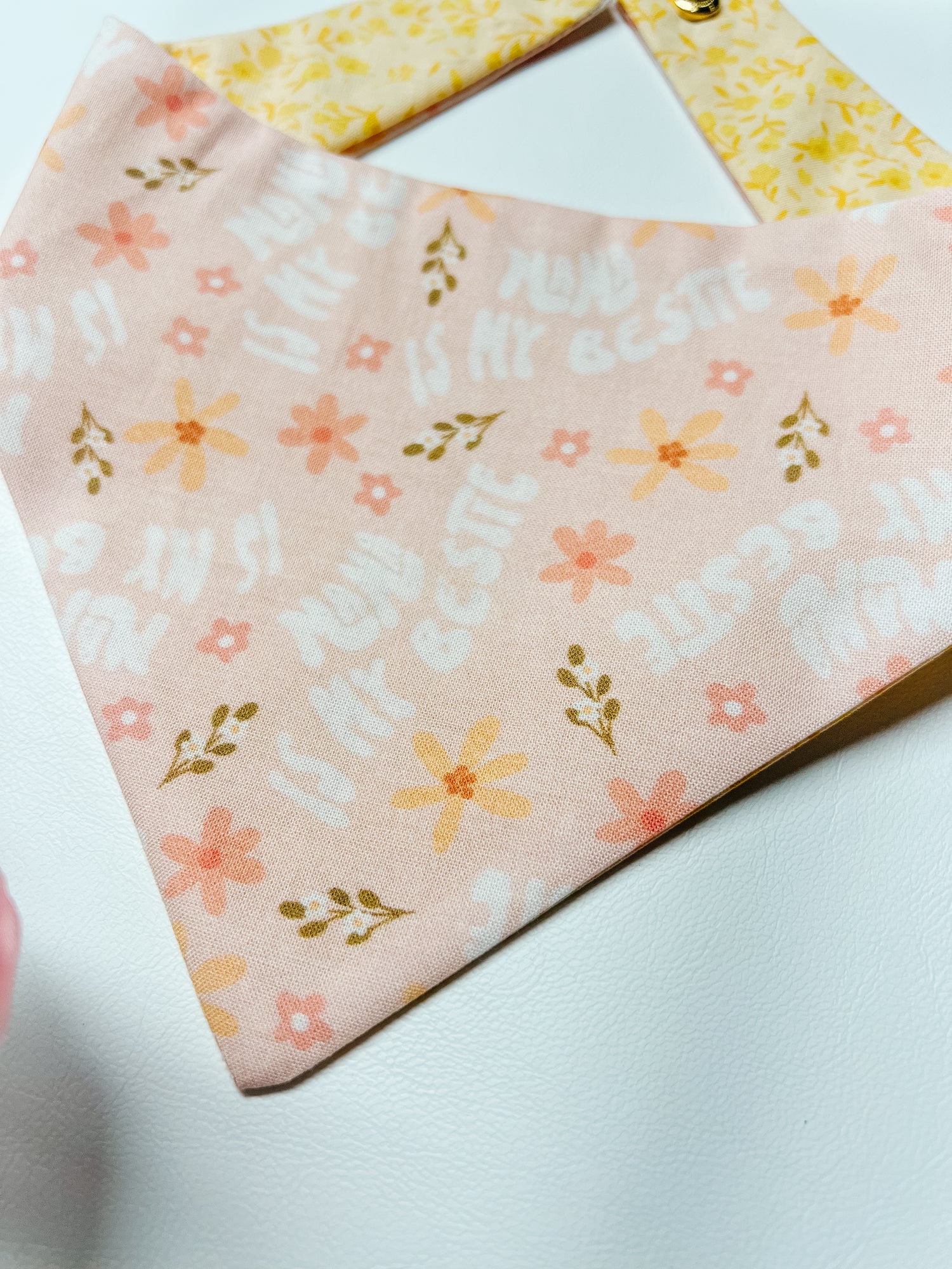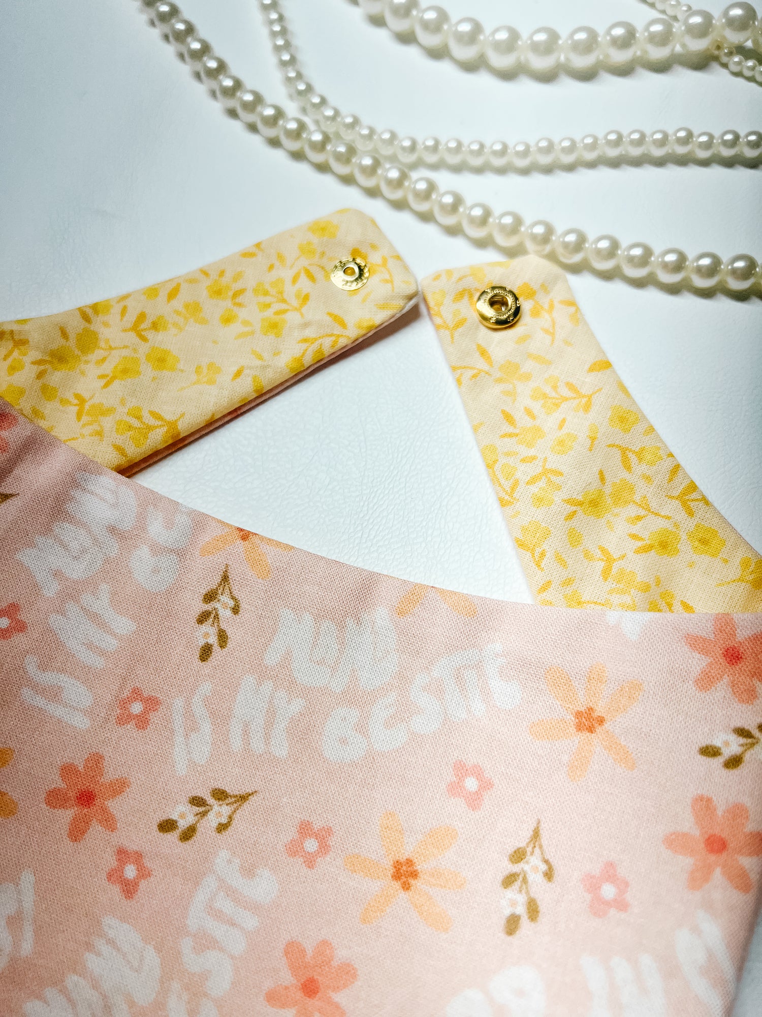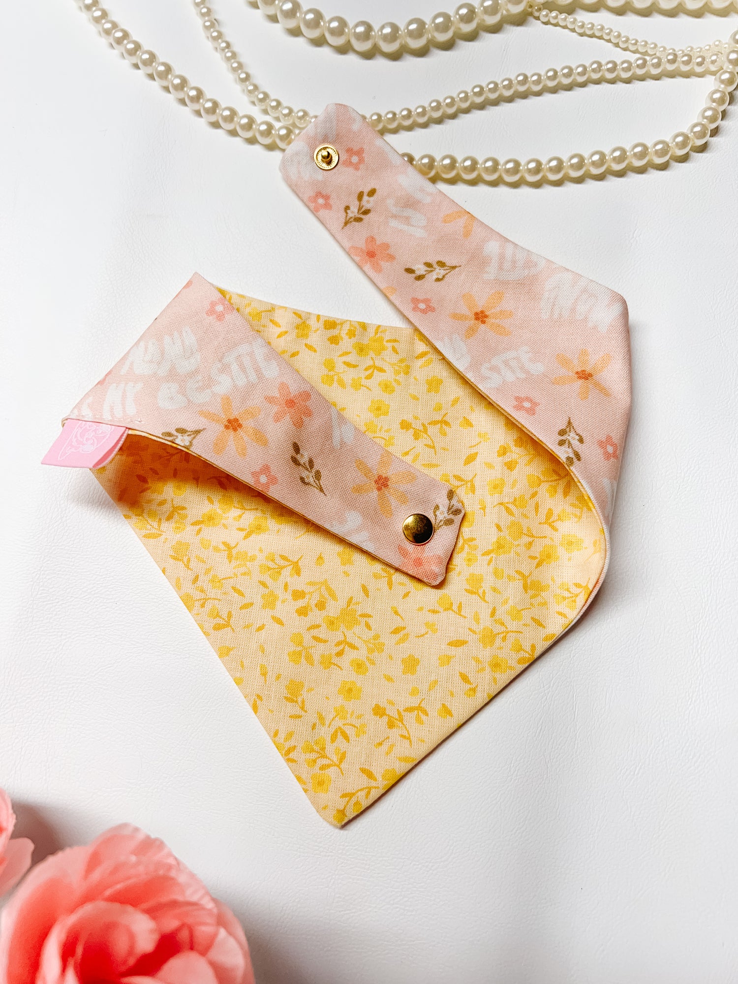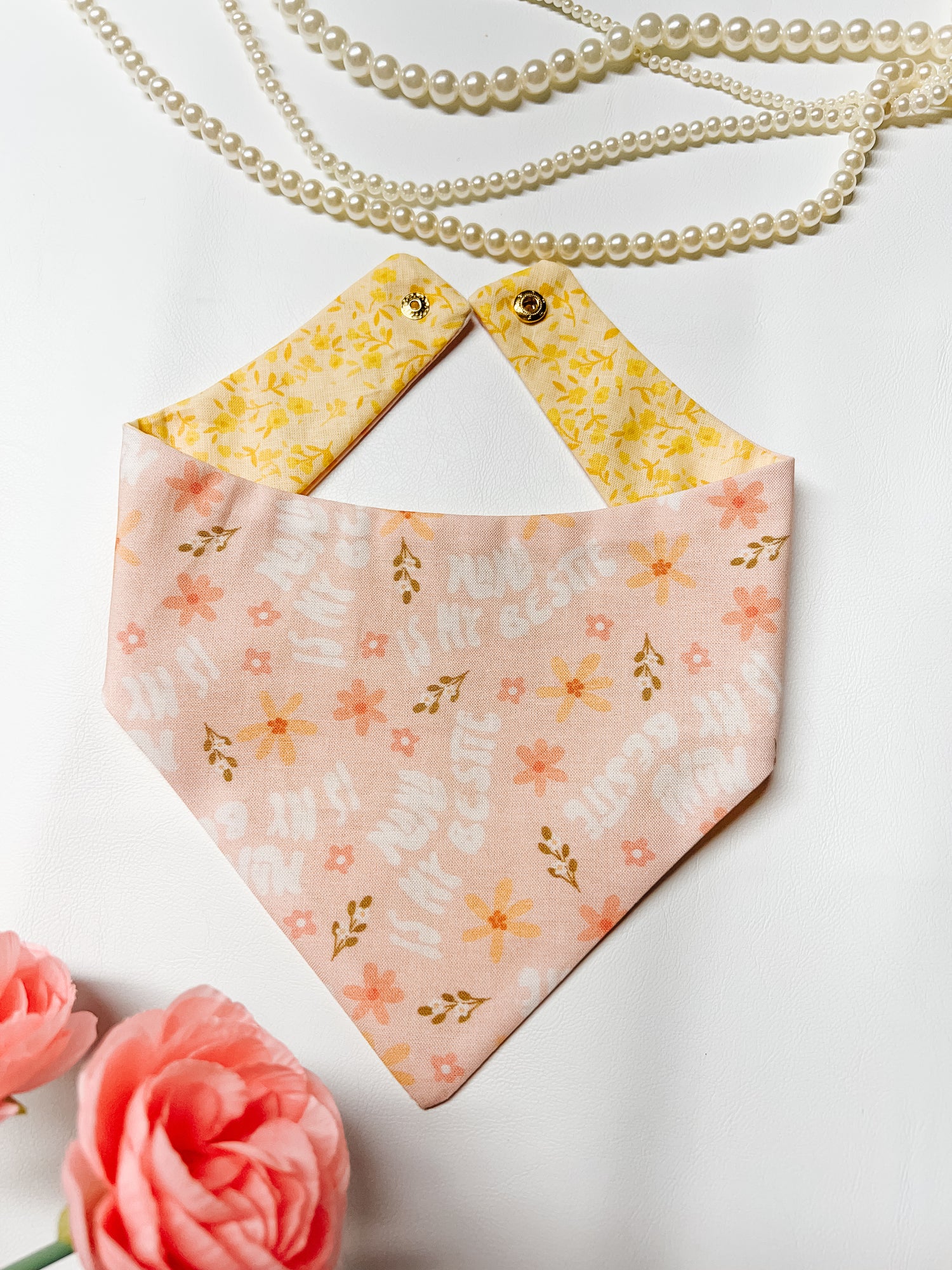 Cotton, curved neck pet bandana with one set of metal snaps. Some styles are reversible so your pet can have 2 outfits in 1 bandana.
