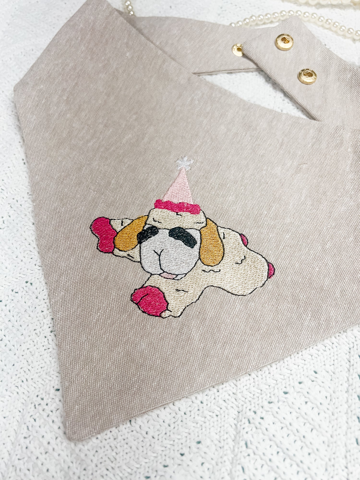 Cotton, curved neck pet bandana with one set of metal snaps. Some styles are reversible so your pet can have 2 outfits in 1 bandana.