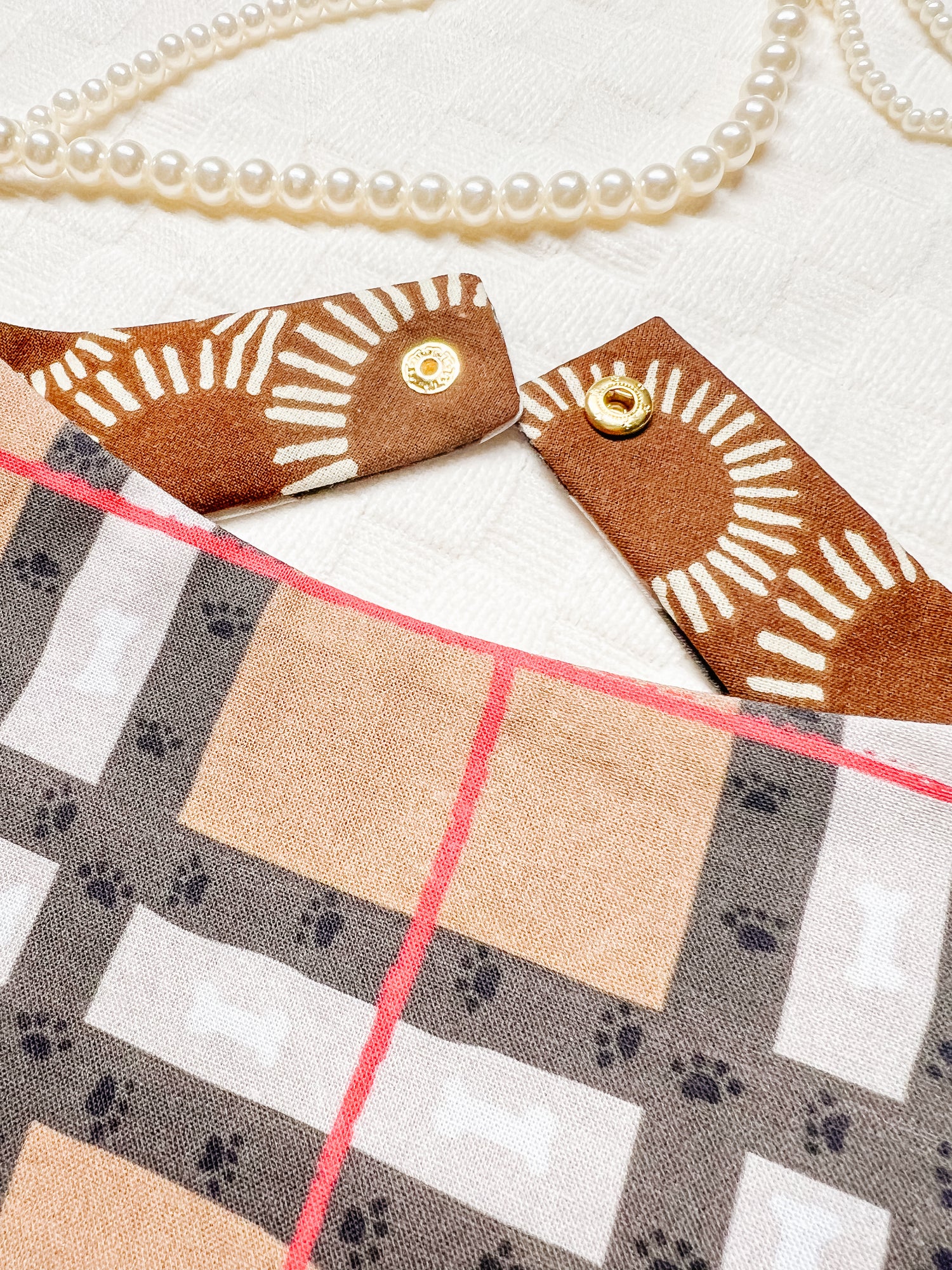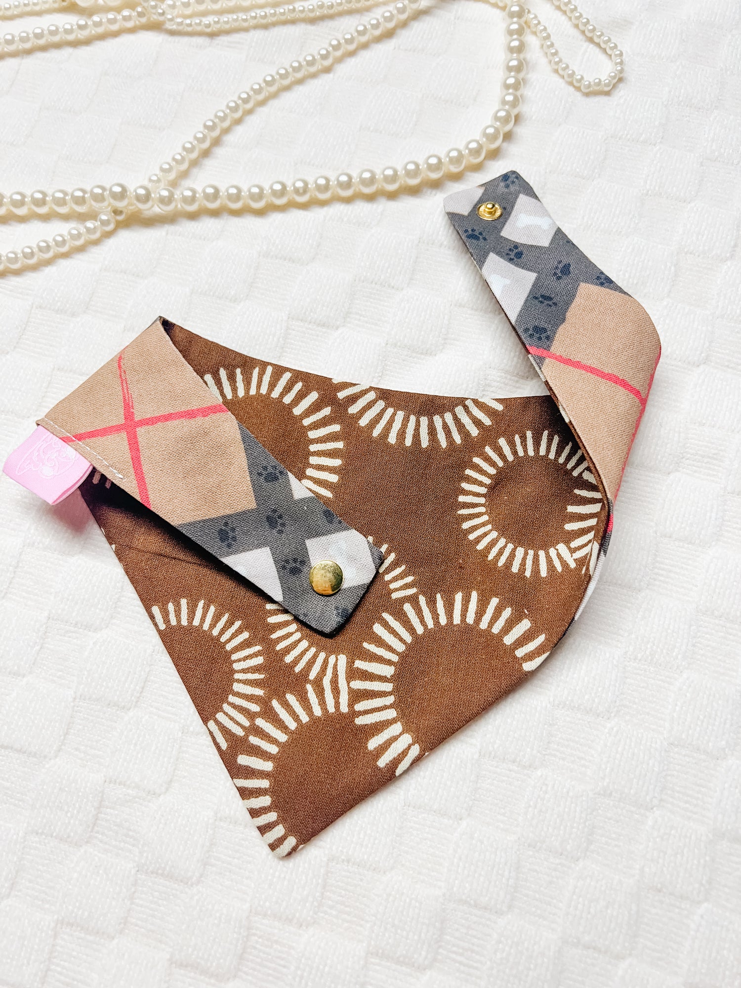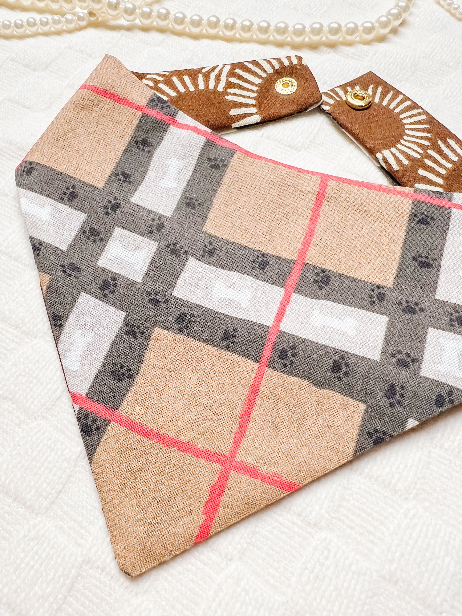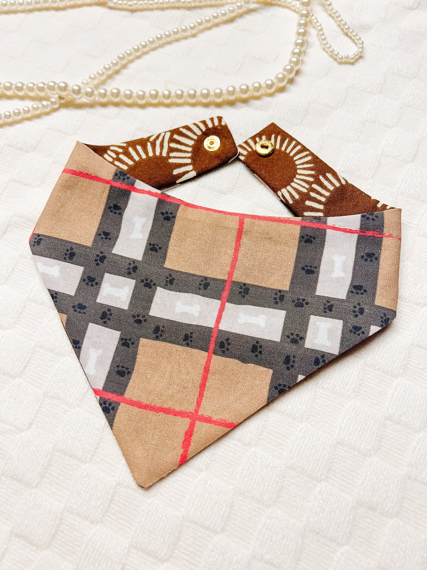 Cotton, curved neck pet bandana with one set of metal snaps. Some styles are reversible so your pet can have 2 outfits in 1 bandana.