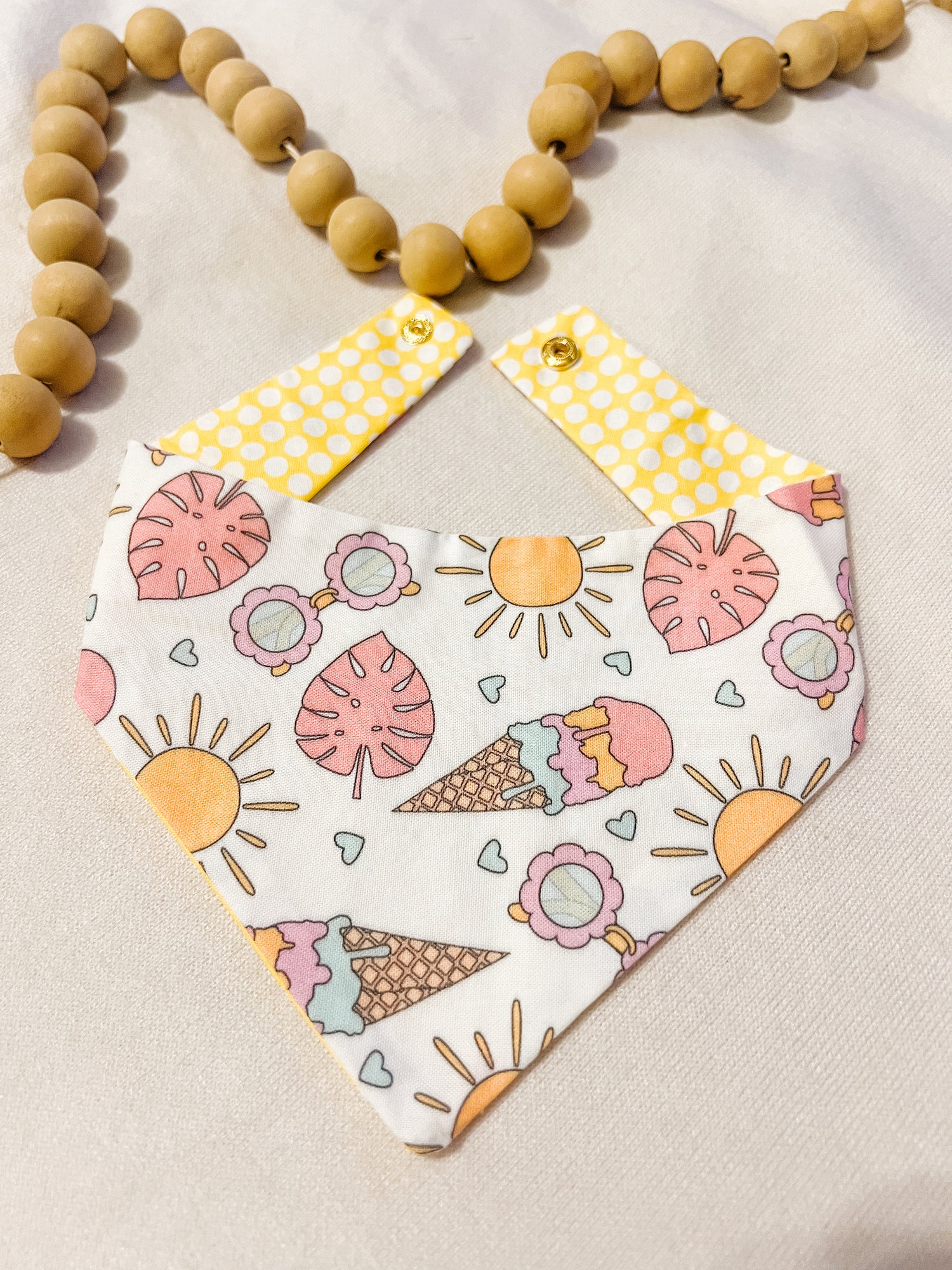 Cotton, curved neck pet bandana with one set of metal snaps. Some styles are reversible so your pet can have 2 outfits in 1 bandana.