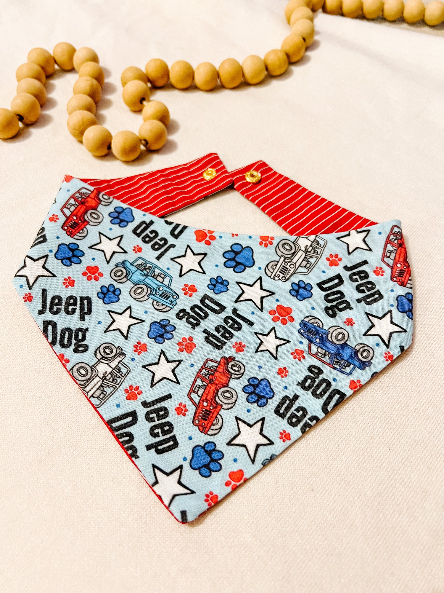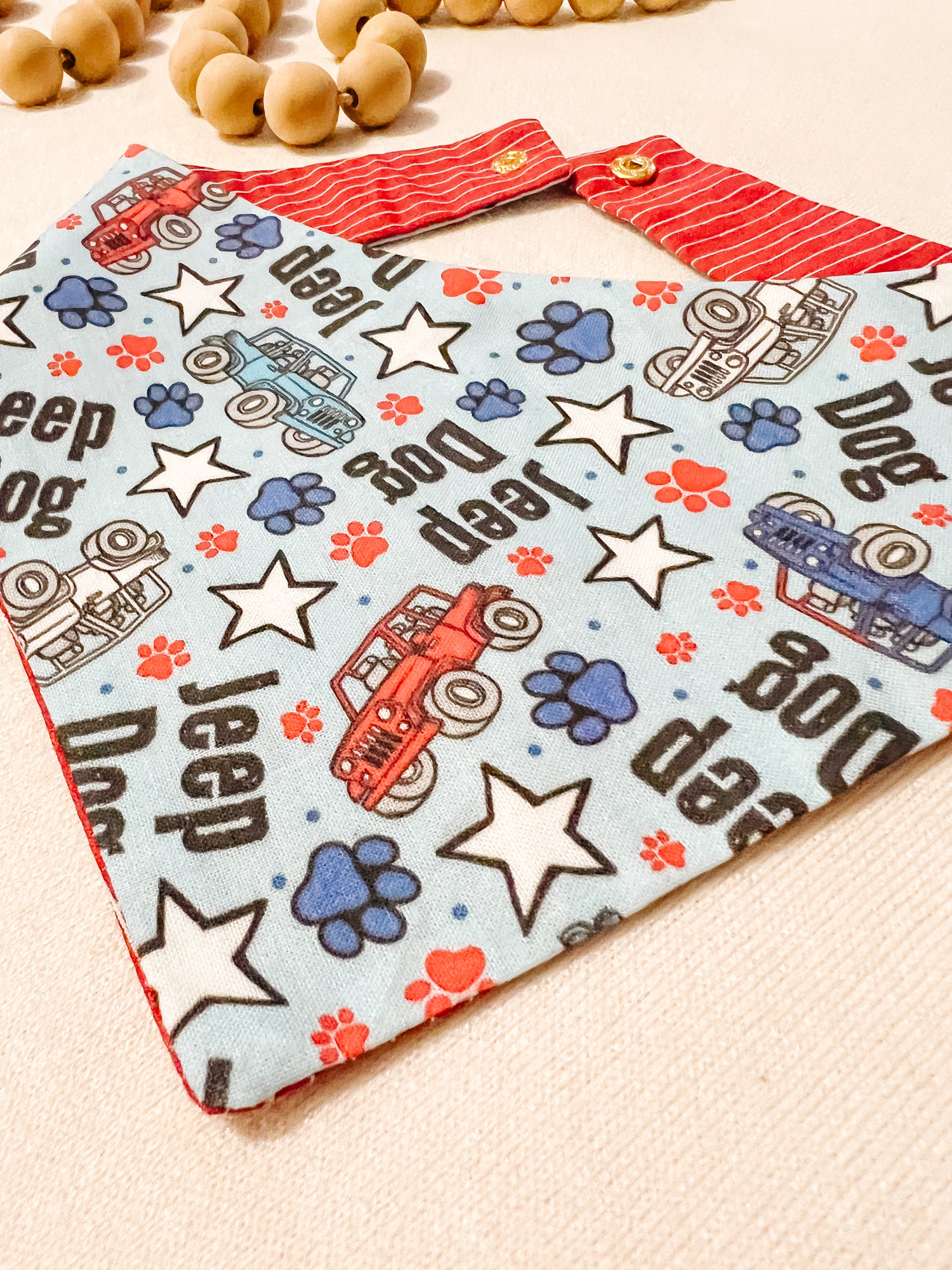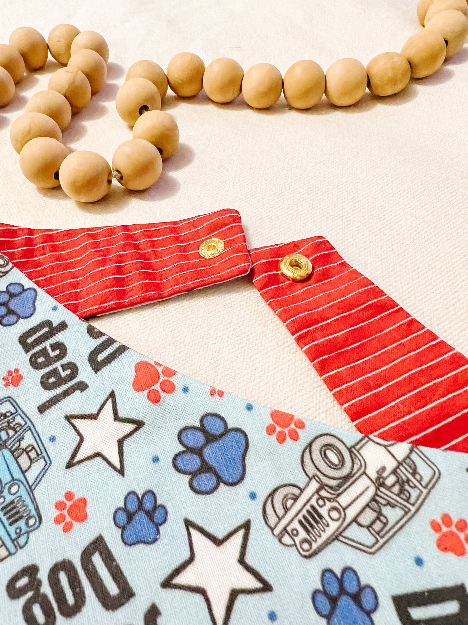 Cotton, curved neck pet bandana with one set of metal snaps. Some styles are reversible so your pet can have 2 outfits in 1 bandana.
